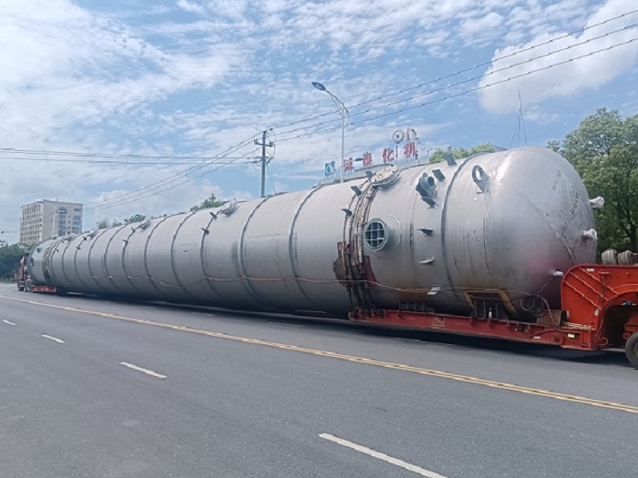 特別值得一提的是,反萃塔突破性采用整體運(yùn)輸方案,徹底顛覆傳統(tǒng)分段制造再組裝的模式。通過量身定制的運(yùn)輸工裝與科學(xué)嚴(yán)謹(jǐn)?shù)穆肪€規(guī)劃,該設(shè)備以近50米的運(yùn)輸長度、超100噸的殼體重量(不含現(xiàn)場安裝內(nèi)件),一舉刷新公司單體設(shè)備運(yùn)輸紀(jì)錄。這一創(chuàng)新實(shí)踐實(shí)現(xiàn)了大型設(shè)備運(yùn)輸技術(shù)的跨越,為同類項(xiàng)目實(shí)施提供了全新范例。